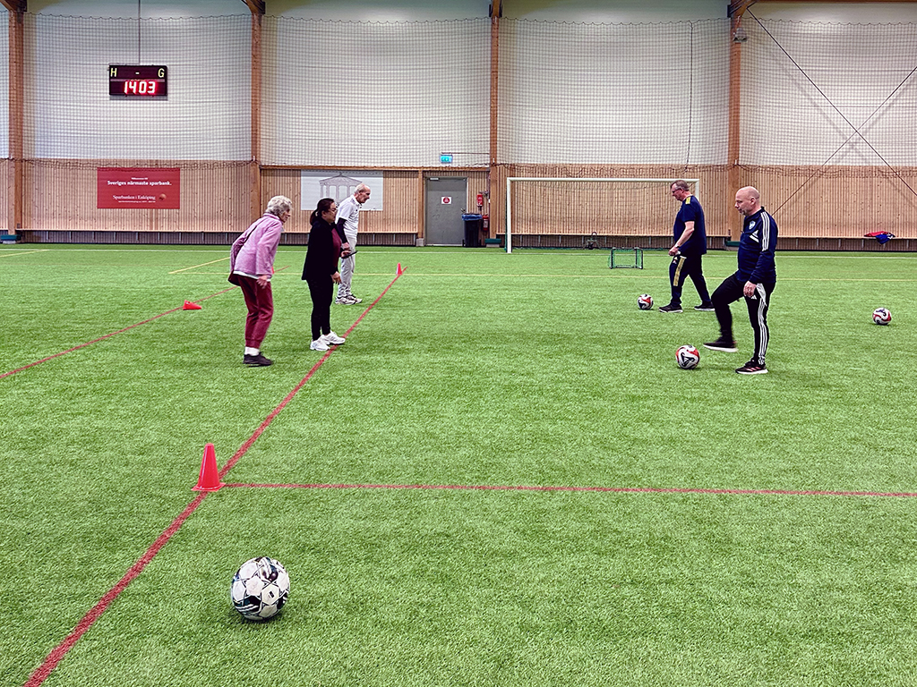 Bollslalom, prickskytte och koordinationsbana. Det var full fart, många skratt och fina tillslag när Bro IK och Svenskt Demenscentrum bjöd in till gåfotbollsträning för demenssjuka i Brohallen norr om Stockholm.